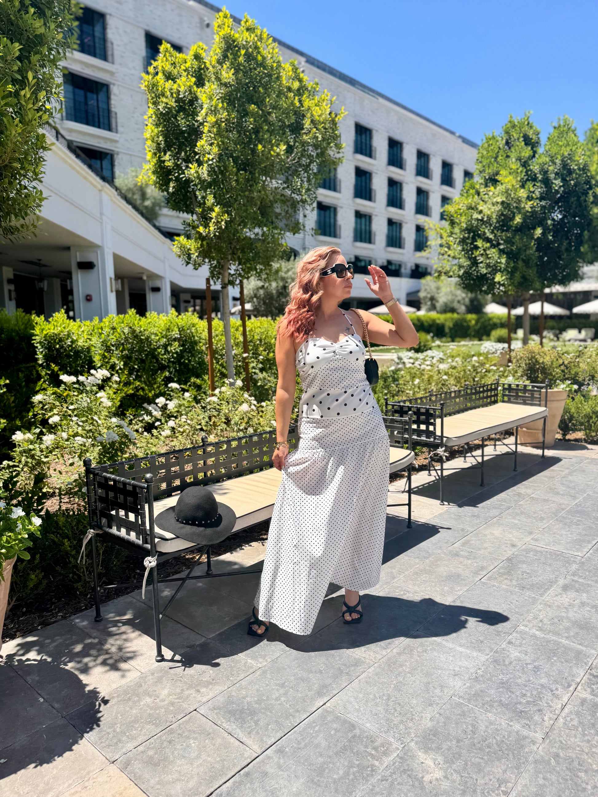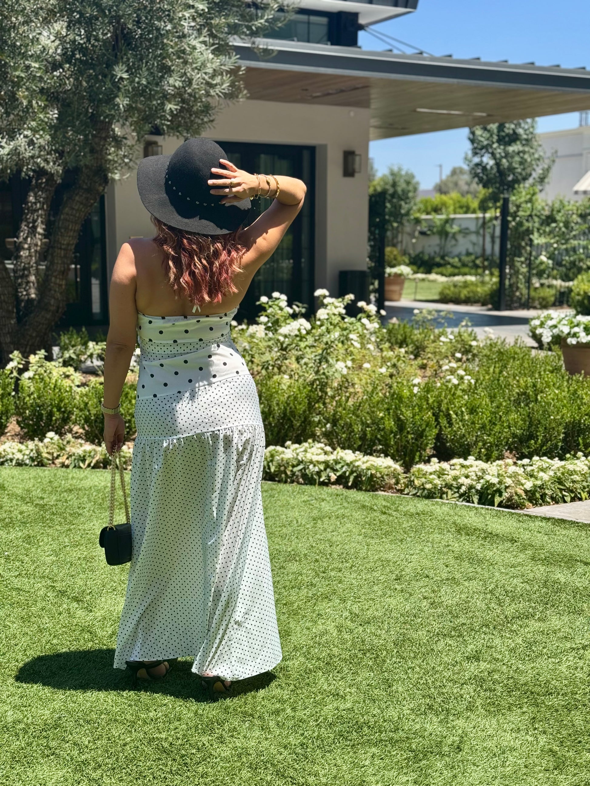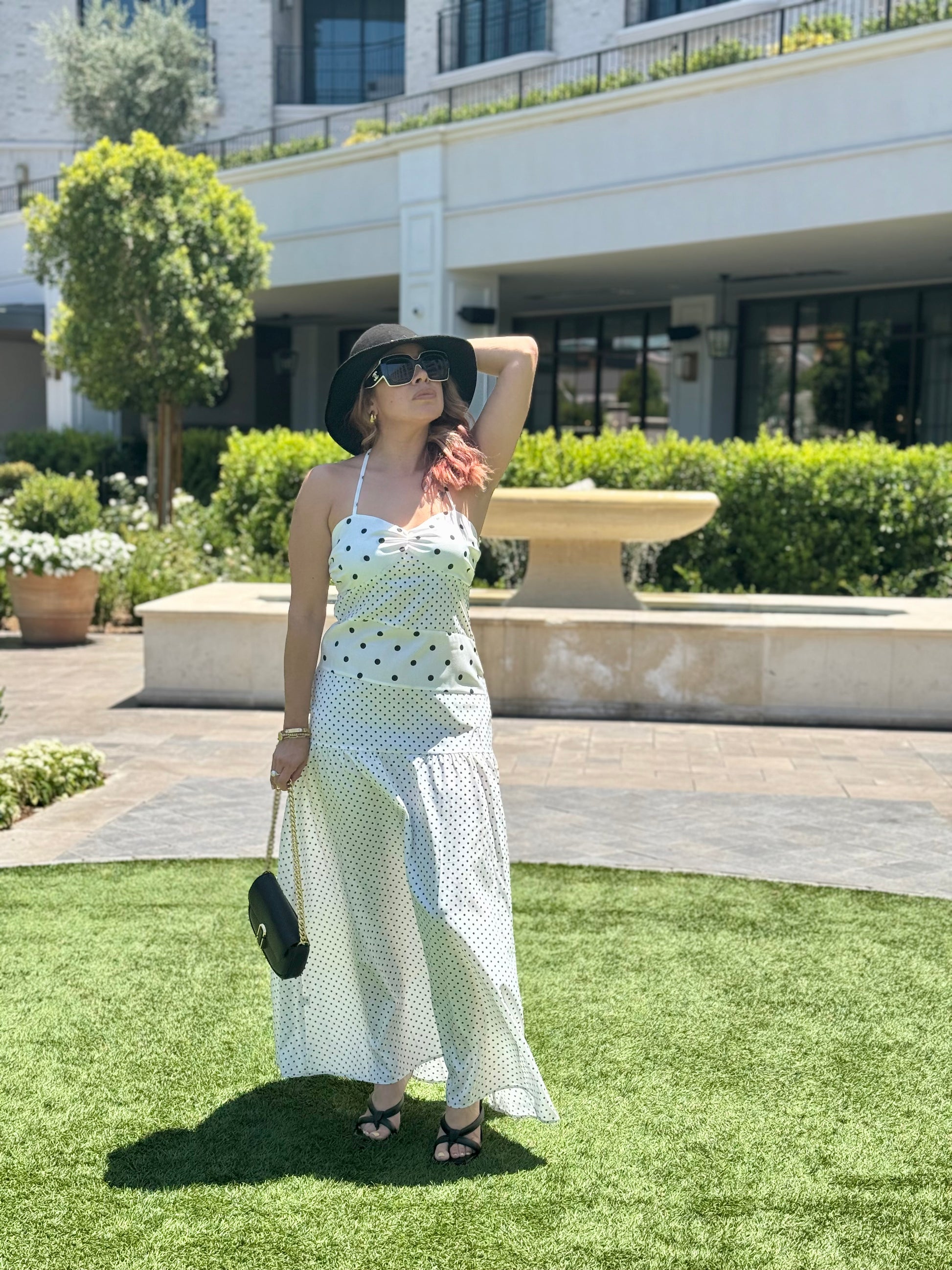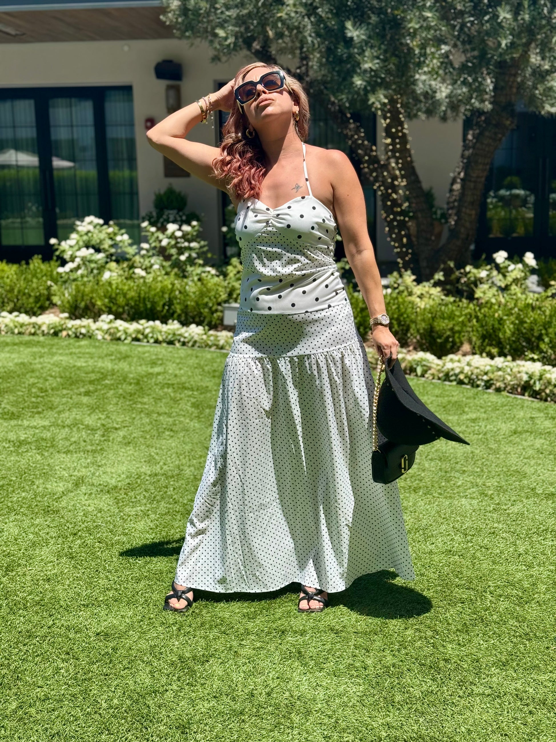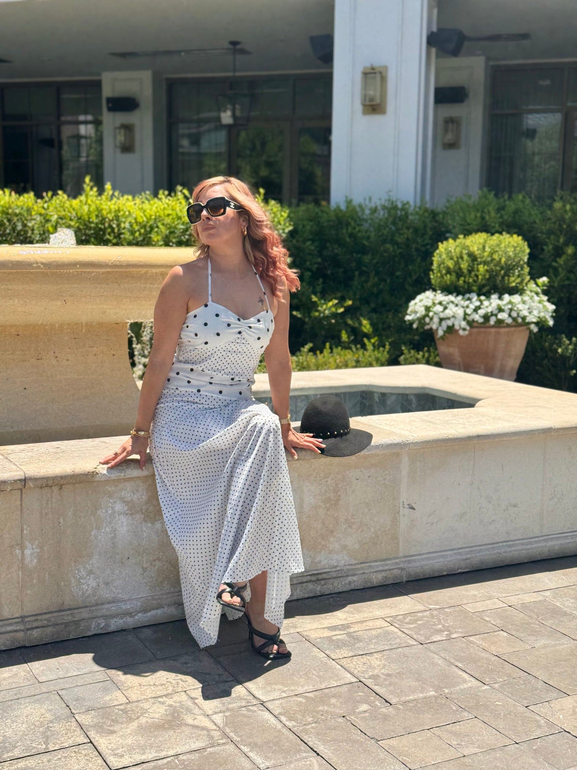 Your new favorite sundress, embrace the changing weather with this season's HOTTEST pattern, “polka dots,” In a flattering silhouette. This long length dress features a sweetheart-neckline halter style, spaghetti straps tie around the neck and a side zipper to hug your waist. Light, breezy & full of movement. Adding a playful finish to its romantic silhouette. Available in a soft & cool polyester material. Wear this for a variety of occasions, style it with heels, sandals, or boots.