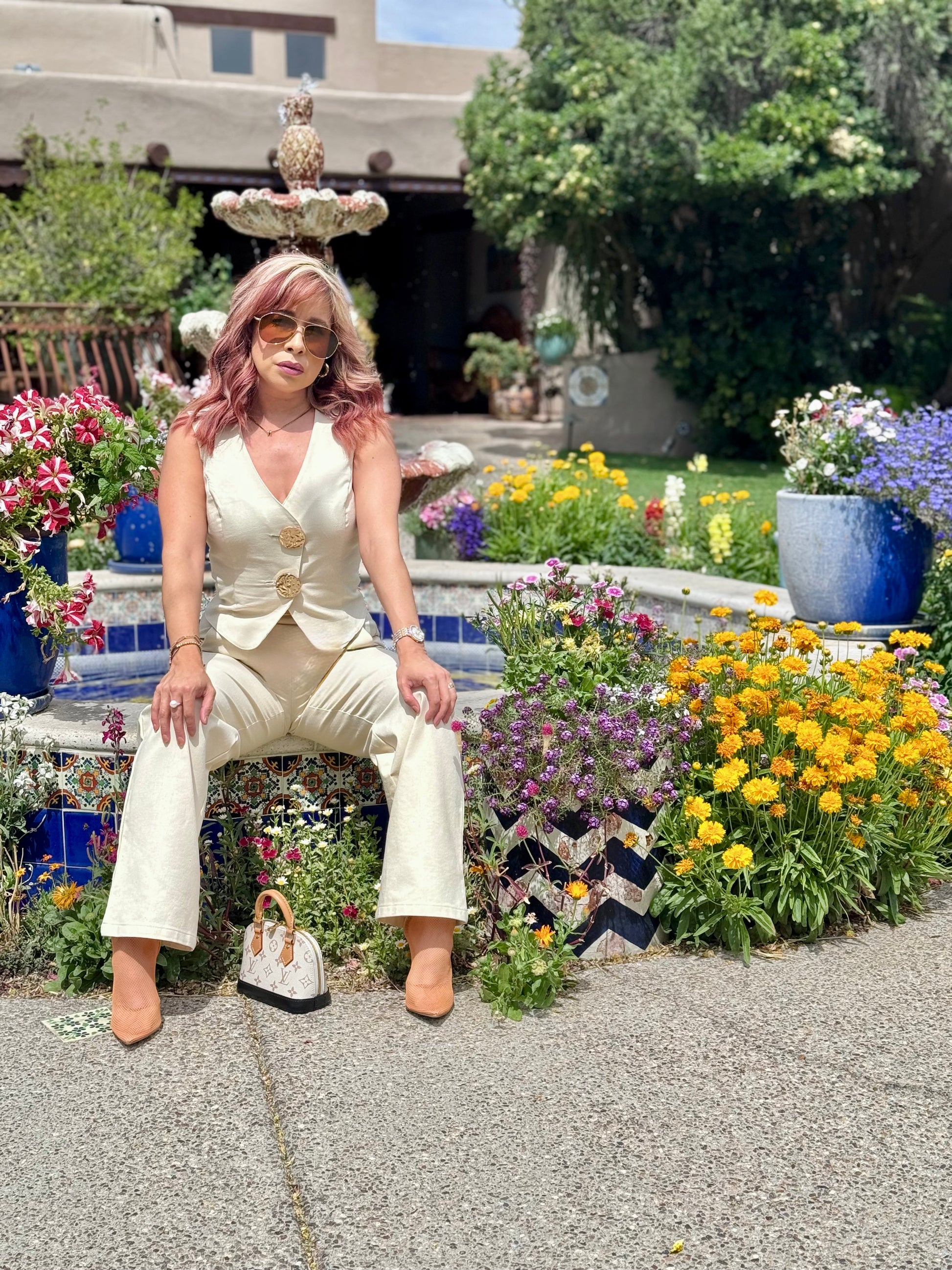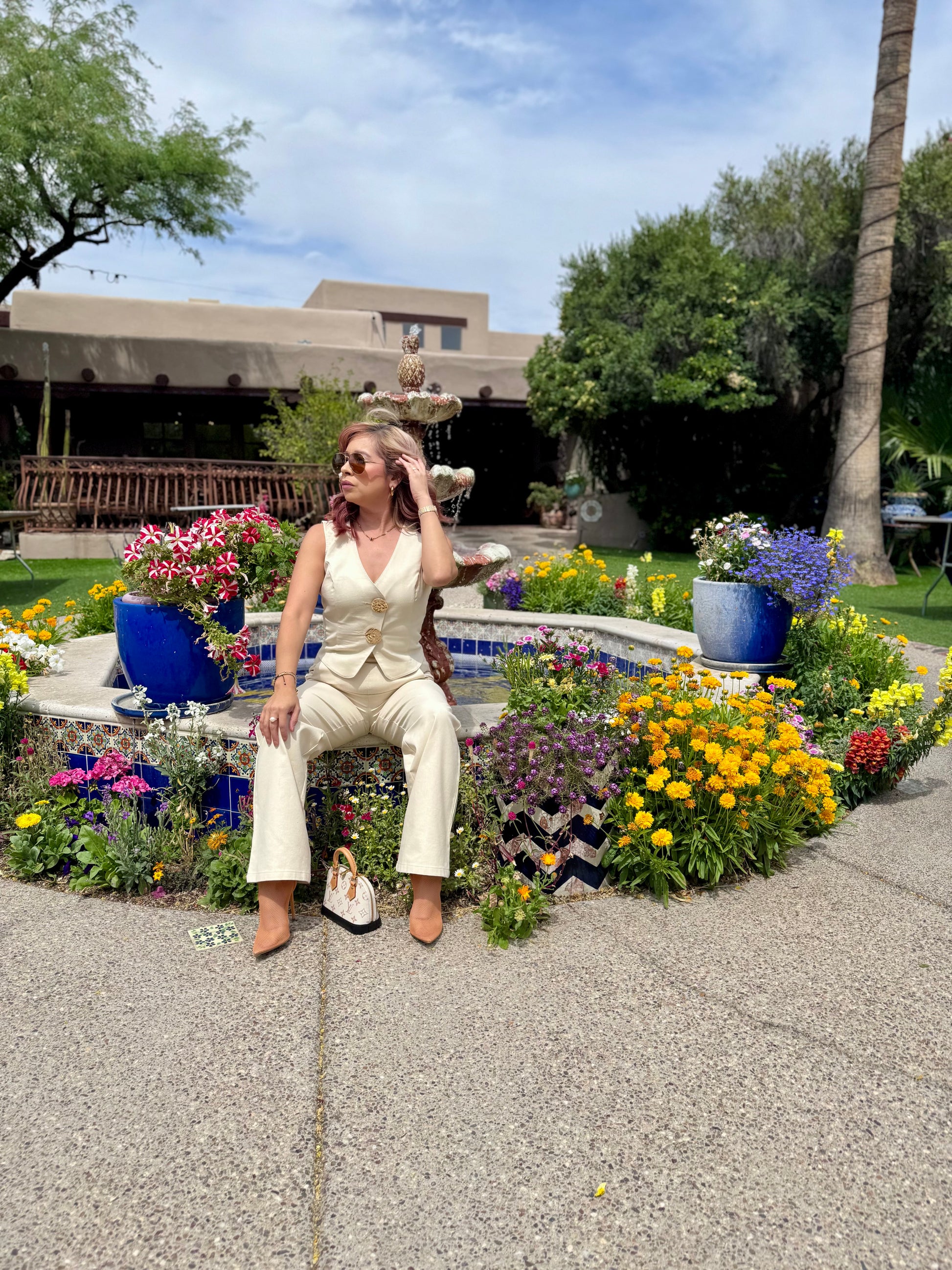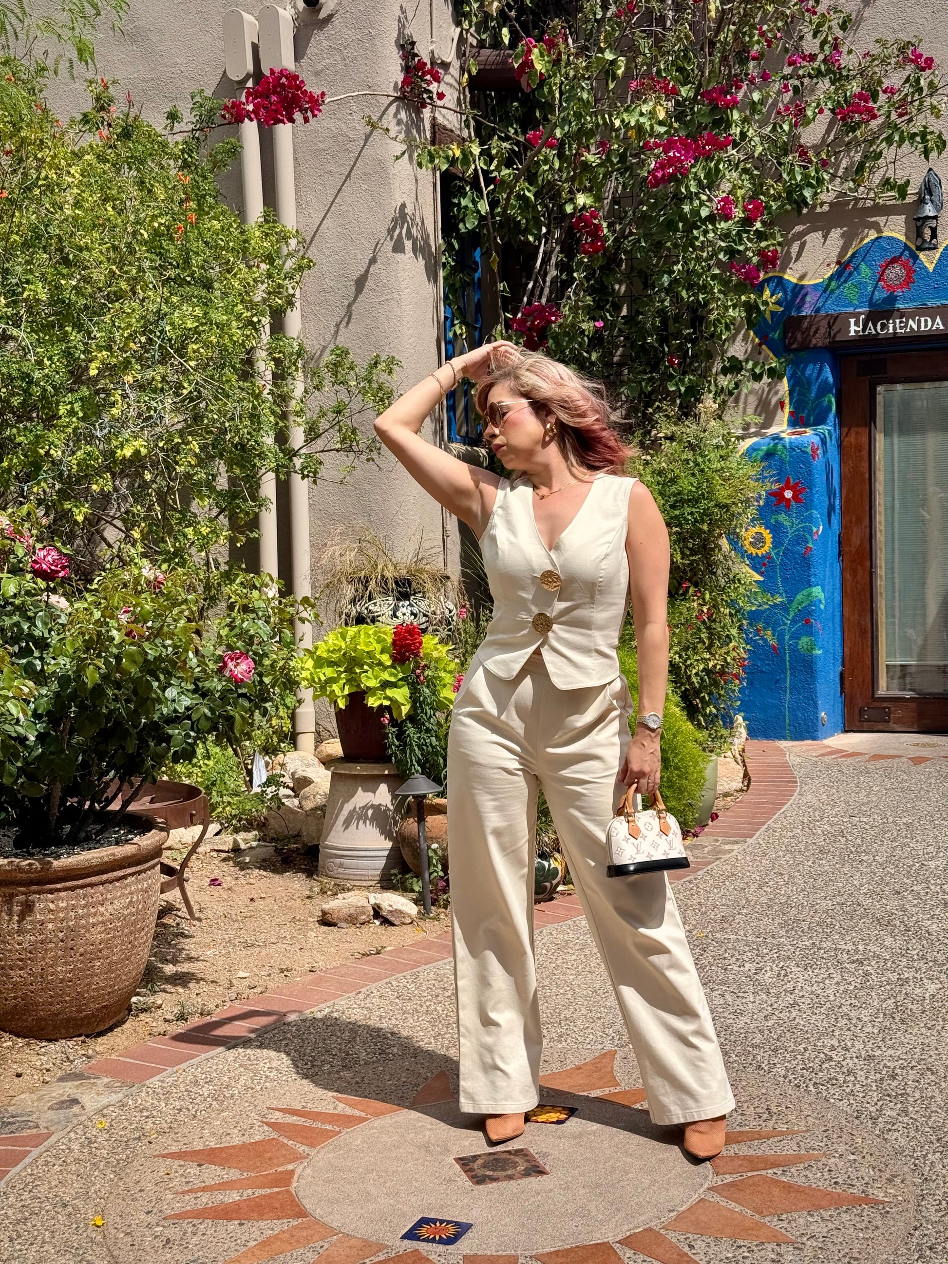 Product: Beige color vest blazer suit set. V neckline with no sleeves, 2-flat metallic stone buttons added for a feminine touch, adjustable back strap, stretch material on waist band of pants, with pockets, bootcut style.