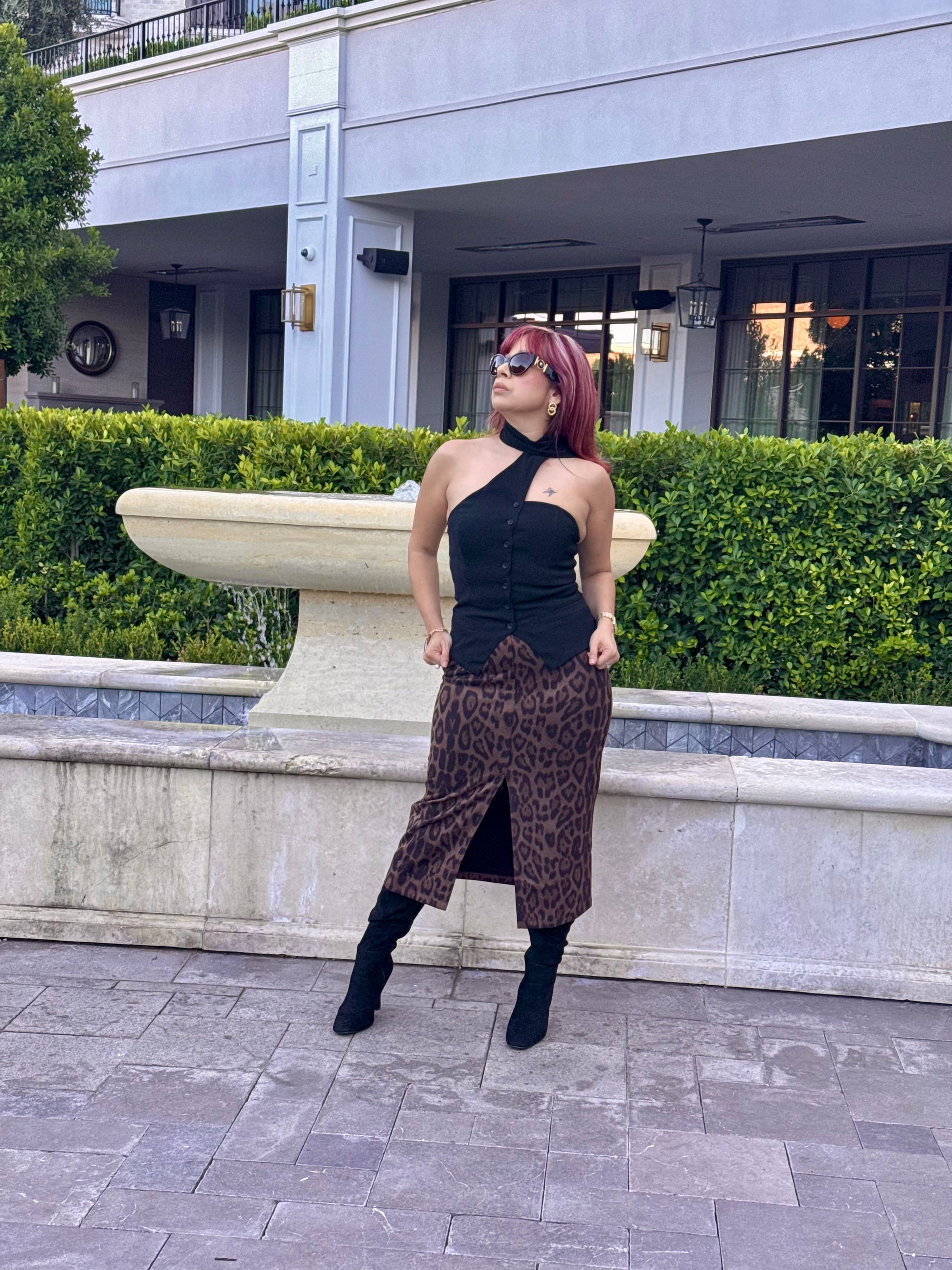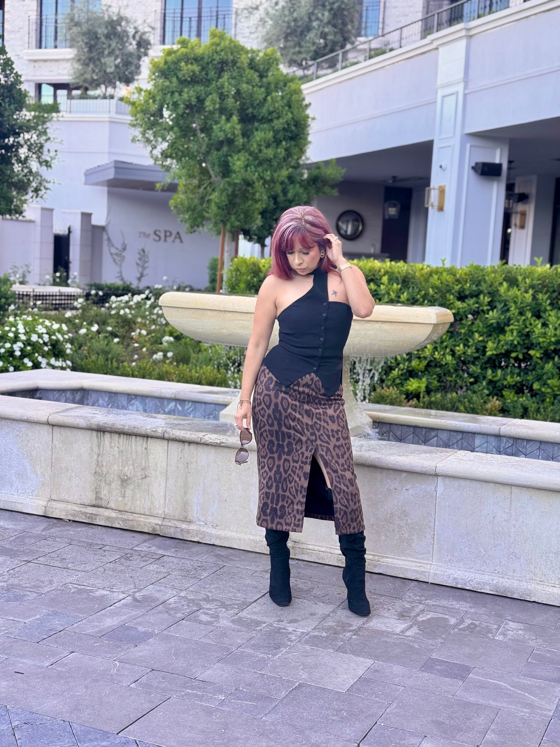 All over deep-toned leopard print skirt brings a fierce, modern edge. Untamed, a sleek midi skirt with center front slit for ease of movement. Fitted & hugs in all the right places, a smooth brushed fabric so soft on skin, an added stretch for a flattering, body skimming fit. Hidden elastic back for added comfort & flexible sizing, side zipper. Style it with boots or heels, spice it up as a curve hugging edgy elevated look & combine with a blouse or graphic tee. Perfect for work, or a date night.
