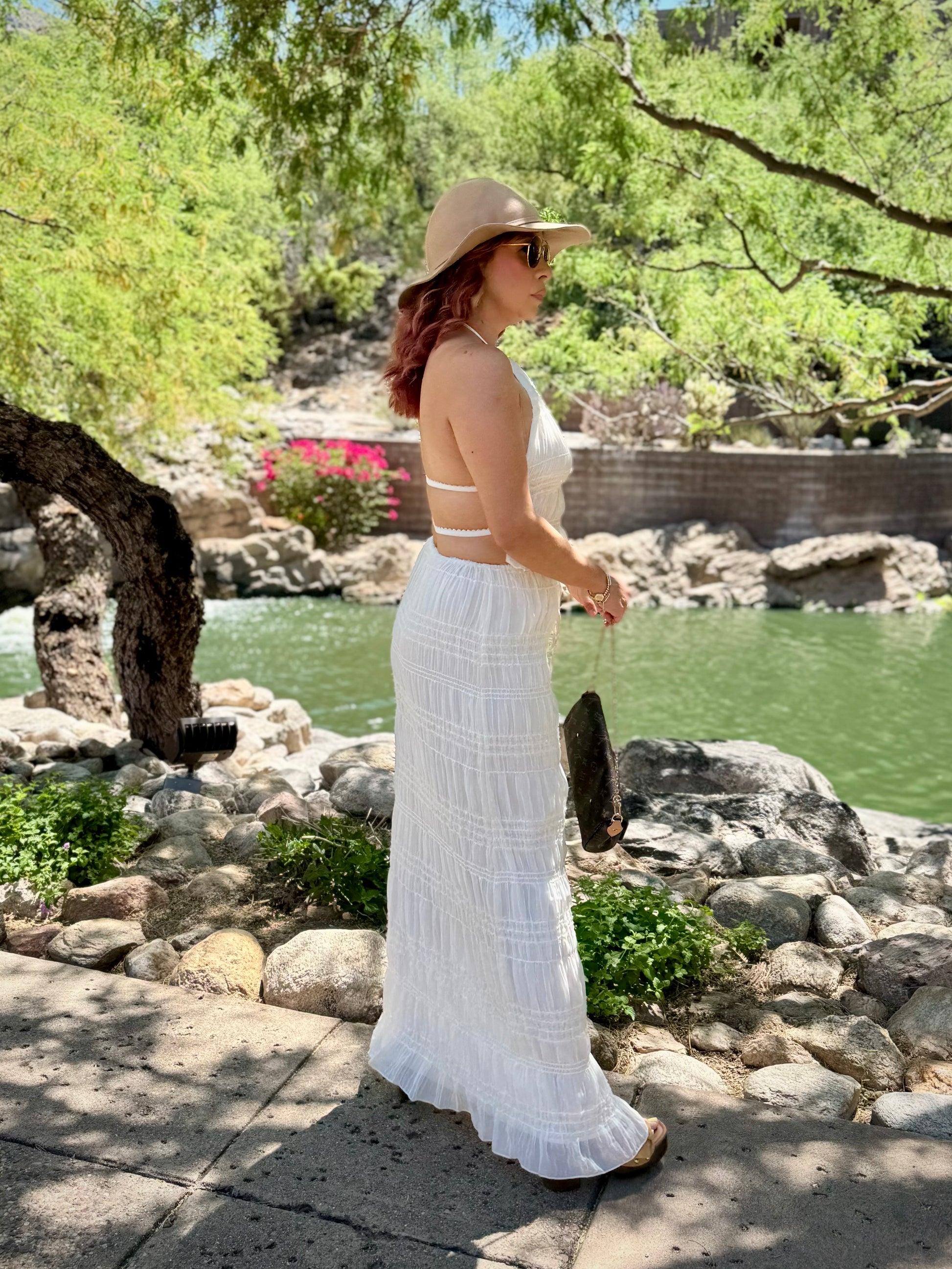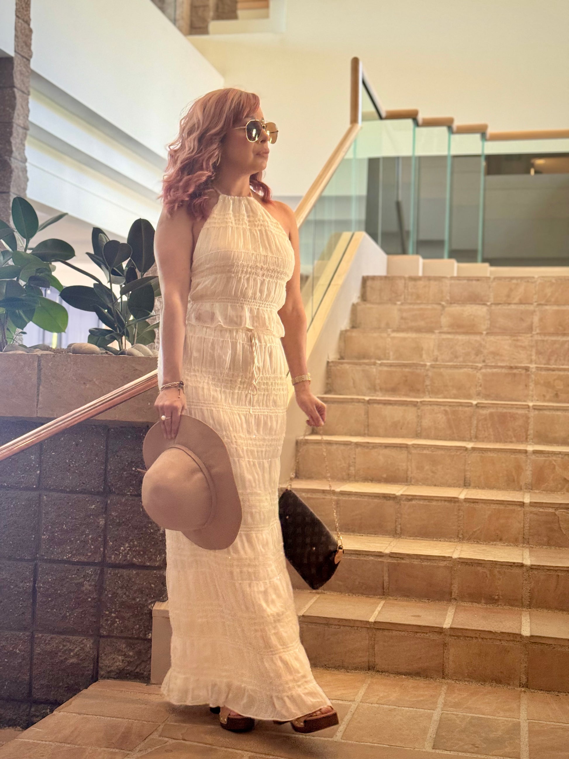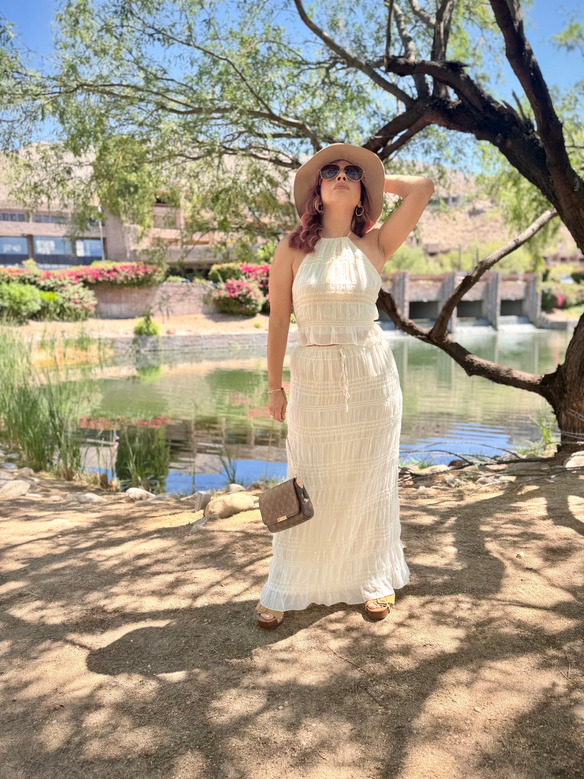 Elevate your warm-weather attire, channel soft tailoring in this halter neck top & skirt set, available in a neutral tone color, chiffon material with a shirred ruched detailed look as it ties around neck with 2-straps in back. Pair it with the matching skirt that ties around waist. This piece moves effortlessly from day to evening. Pair it with booties, pointed toe heels, wedges, mules, or sandals for a fresh 2-piece look.