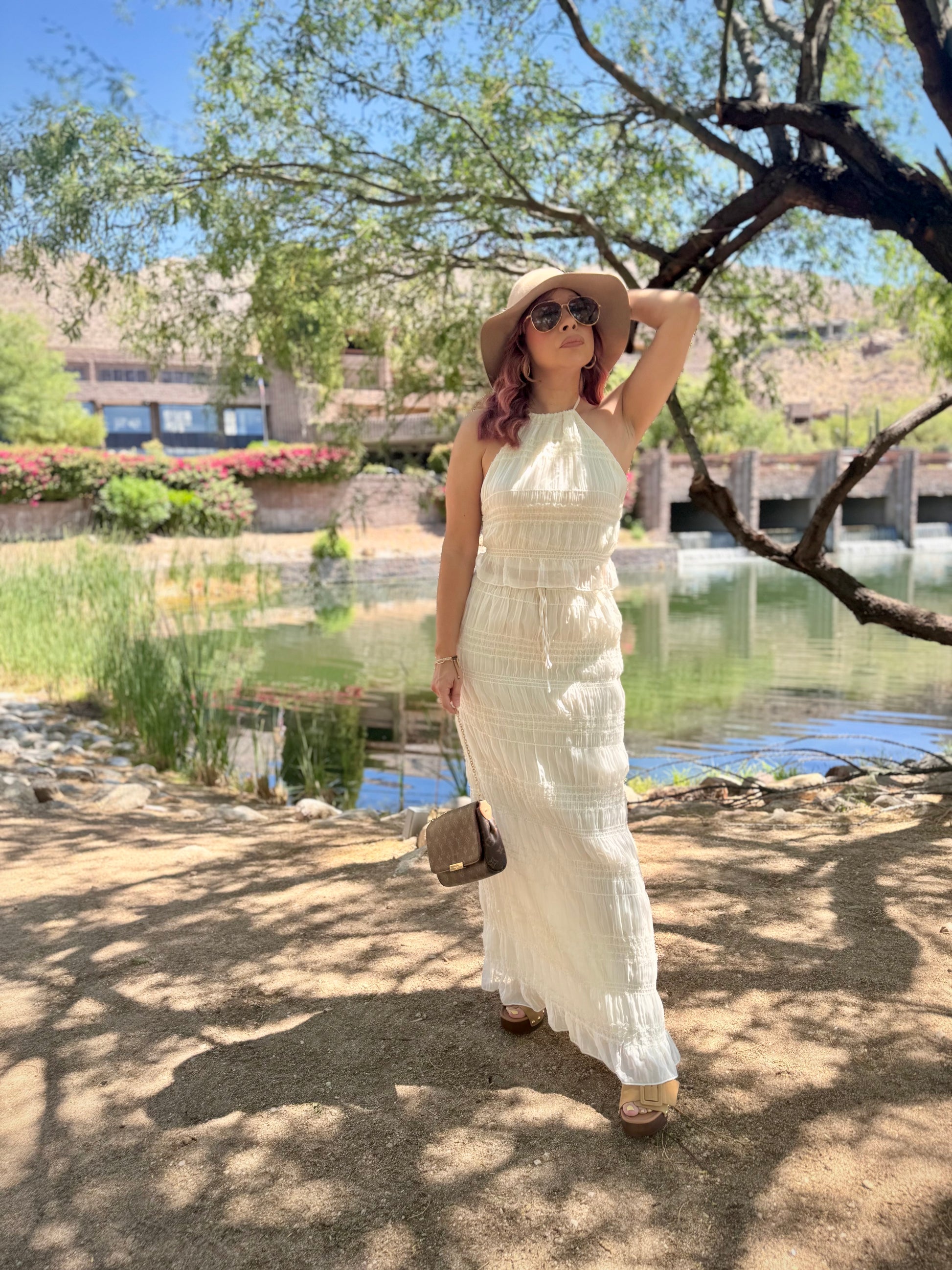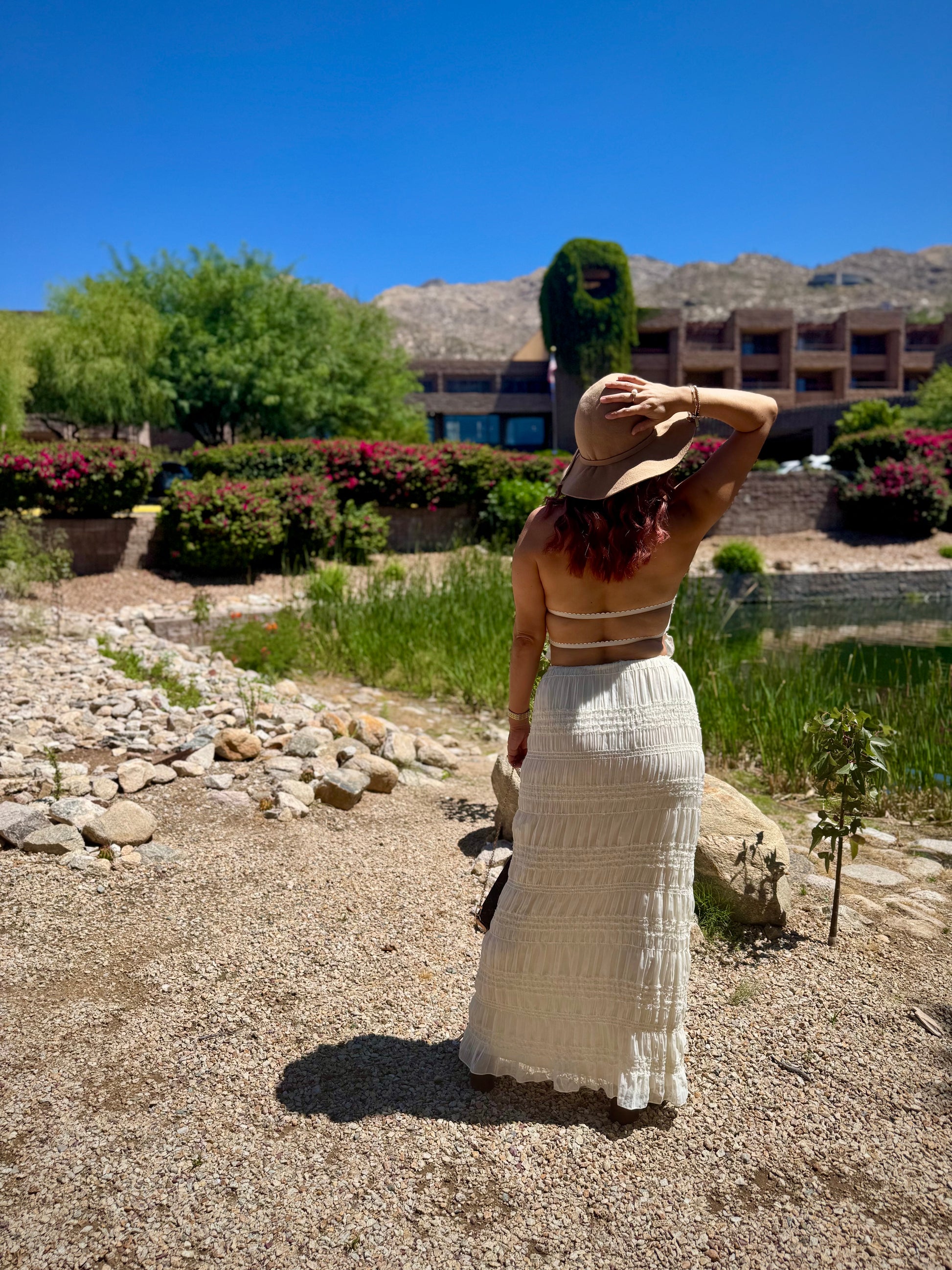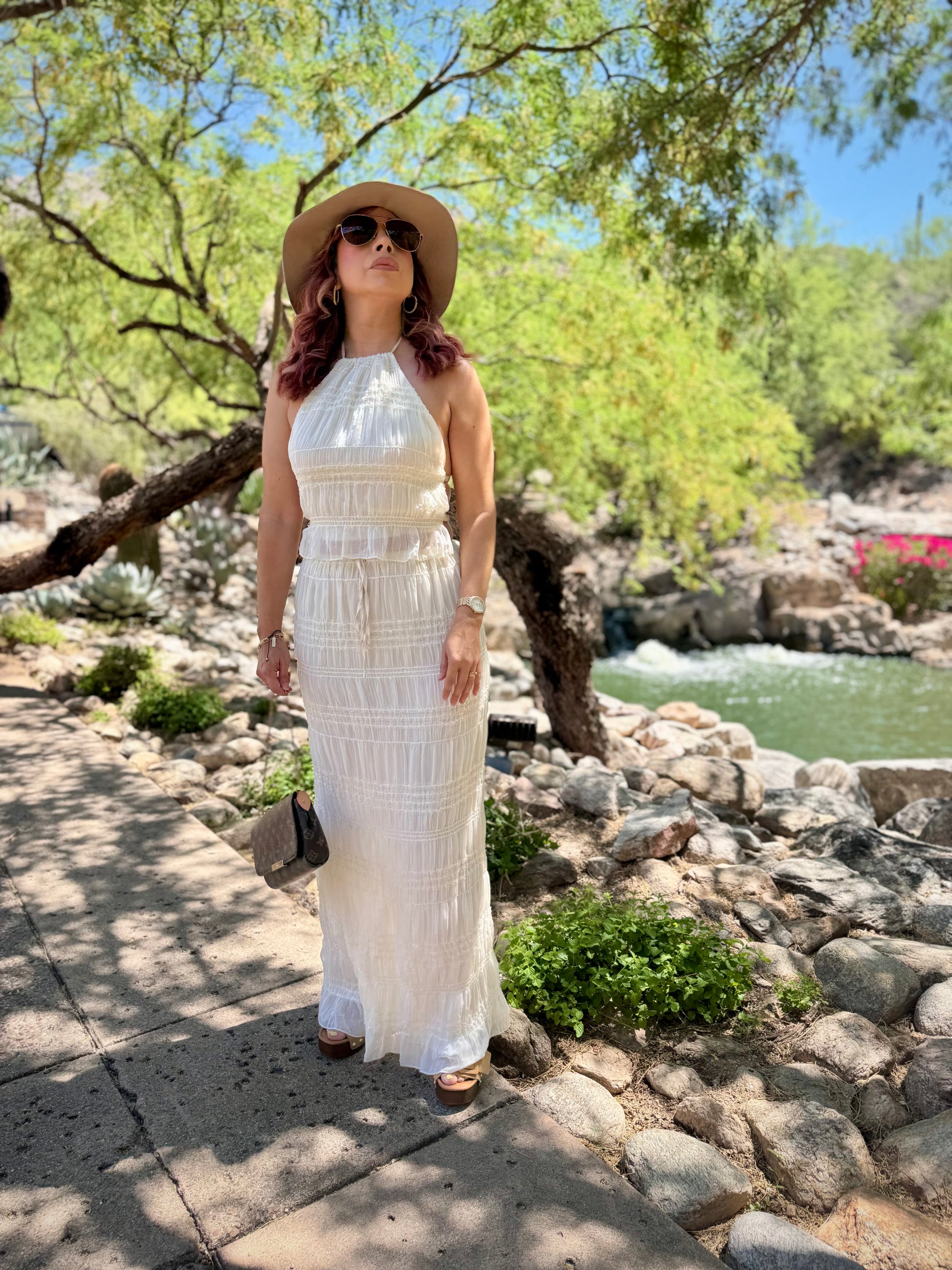 Elevate your warm-weather attire, channel soft tailoring in this halter neck top & skirt set, available in a neutral tone color, chiffon material with a shirred ruched detailed look as it ties around neck with 2-straps in back. Pair it with the matching skirt that ties around waist. This piece moves effortlessly from day to evening. Pair it with booties, pointed toe heels, wedges, mules, or sandals for a fresh 2-piece look.